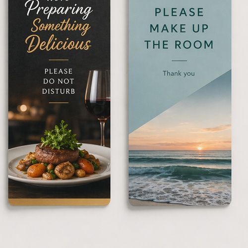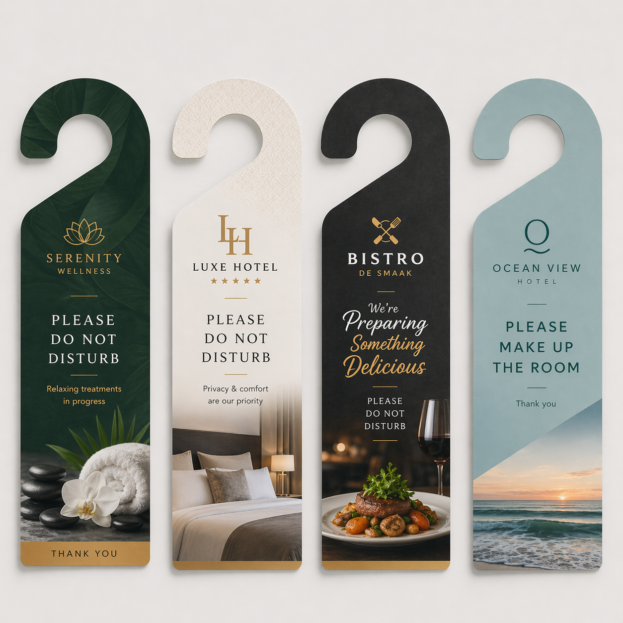 Of het nu is om gasten een rustige nacht te gunnen of een boodschap subtiel over te brengen. Perfect voor hotels, B&B’s, evenementen of promotionele acties. Laat jouw deurhangers enkel- of dubbelzijdig in full color bedrukken met je eigen ontwerp, logo of tekst. Voor extra stevigheid kun je kiezen voor een scheurvast laminaat, zodat ze langer meegaan, ook bij veelvuldig gebruik.