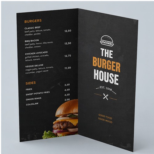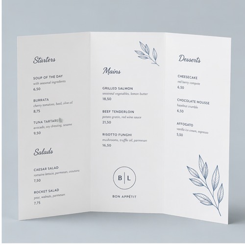 Geef je gasten een duidelijke, stijlvolle en uitnodigende menukaart. Bestel vandaag nog jouw menukaarten en combineer functionaliteit met professionele uitstraling!